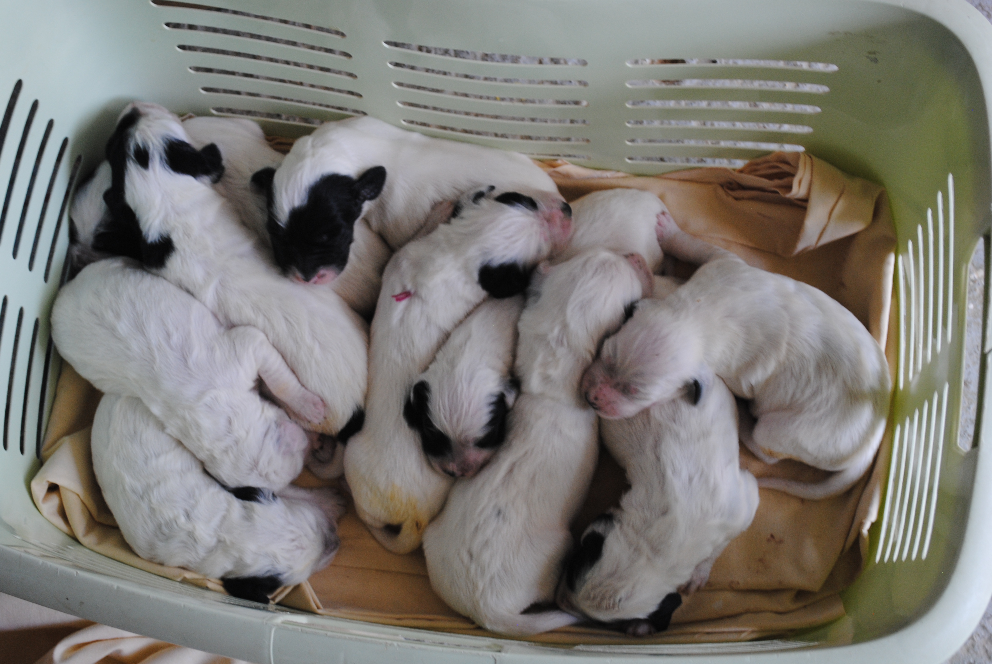 A 3 semaines tout le monde va bien et déjà 4 sortent du lot, passent la marche du parc pour aller manger les croquettes de maman